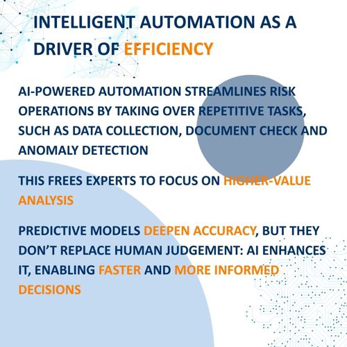 AI‑driven automation is reshaping operational processes within risk functions. Advanced automation solutions handle repetitive tasks such as data collection, document monitoring, information verification, and the automatic categorization of anomalies. This reduces processing time and frees analytical capacity for higher‑value strategic activities.