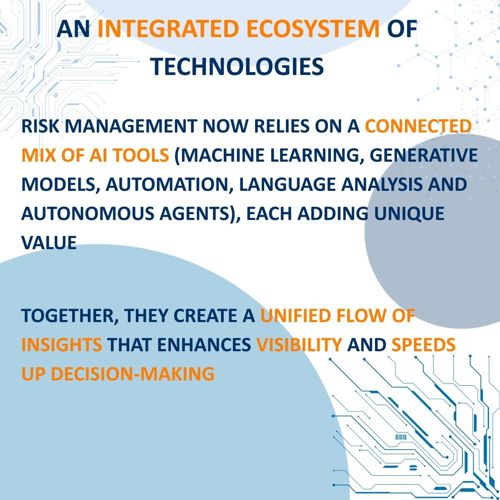 Modern risk management does not rely on a single technology but rather on a comprehensive ecosystem that includes machine learning, generative models, robotic process automation, linguistic analysis tools and autonomous agents. Each component contributes a specific capability, enabling a more complete, coherent, and multidimensional assessment.