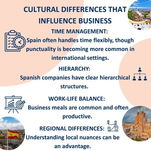 Spain has a more flexible approach to time than Northern Europe. Meetings may start slightly later than scheduled, and agendas can shift. However, punctuality is becoming more common in international contexts.