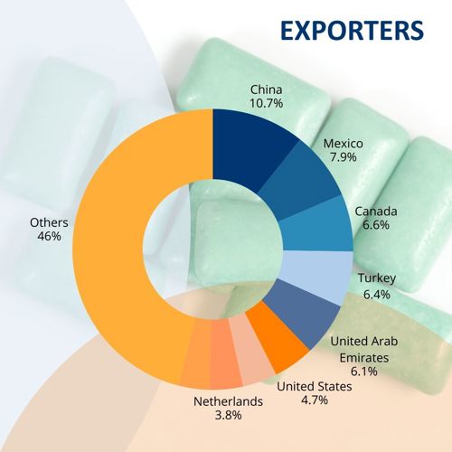 Chewing gum remains a small but steady segment of global trade. Production is concentrated in competitive manufacturing hubs like China and Mexico, while demand is strongest in large consumer markets such as the United States and in high‑consumption Gulf countries.