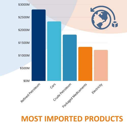 The top import categories (petroleum products, cars, and pharmaceuticals) highlight the country’s strong domestic consumption and industrial needs.