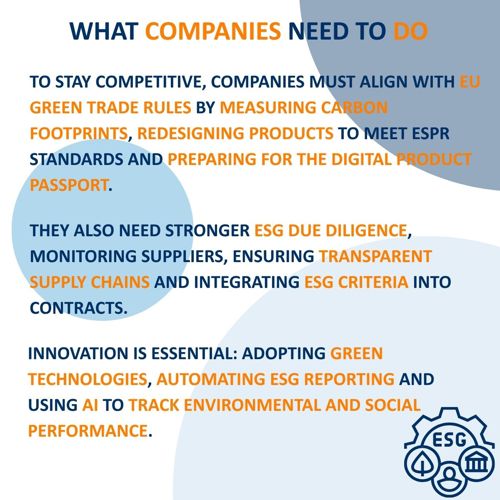 As global trade enters a new era shaped by sustainability, companies can no longer view ESG policies as mere regulatory hurdles but must instead recognize them as catalysts for long‑term competitiveness. The shift toward greener supply chains, transparent reporting, and lower‑impact production processes is redefining market access and reshaping the balance of power across industries. While the transition demands investment, adaptation, and strategic foresight, it also opens the door to innovation, new partnerships, and expanded opportunities, especially for businesses and emerging economies ready to align with the evolving expectations of regulators, investors, and consumers. In this landscape, embracing ESG is no longer optional: it is the foundation for resilient, future‑proof growth in the global marketplace.