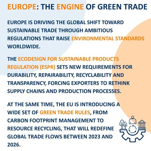 Europe has positioned itself as the driving force behind the global shift toward green trade, thanks to a comprehensive series of regulations designed to raise sustainability standards across international markets. One of the most impactful measures is the Ecodesign for Sustainable Products Regulation (ESPR), which has been in force since 2024 and requires companies to meet new criteria related to durability, repairability, recyclability, and full transparency through the Digital Product Passport. These obligations significantly affect exporters outside the EU, who must now rethink their supply chains, materials, and production processes to access the European market.