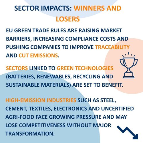 The shift toward green trade inevitably creates winners and losers across different industries. Sectors connected to green technologies, such as battery production, renewable energy components, recycling, circular economy solutions and sustainable materials, are positioned to thrive, fueled by growing demand and regulatory alignment. This is especially evident in the electric vehicle industry, where the EU has introduced a detailed methodology for calculating and verifying the carbon footprint of EV batteries, making compliance both a challenge and an opportunity for companies able to innovate quickly.