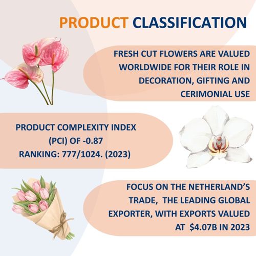Fresh cut flowers have a Product Complexity Index (PCI) of -0.87, ranking 777 out of 1,024 products in 2023, which highlights their relatively low complexity compared to industrial goods but immense importance in terms of trade volume and cultural value.