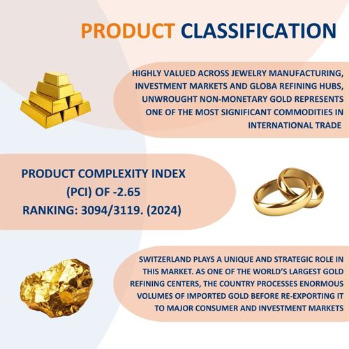 Switzerland plays a unique and strategic role in this market. As one of the world’s largest gold refining centers, the country processes enormous volumes of imported gold before re‑exporting it to major consumer and investment markets. Despite its extremely low Product Complexity Index (PCI –2.65, ranked 3,094th out of 3,119), unwrought non‑monetary gold remains the backbone of Switzerland’s trade structure.