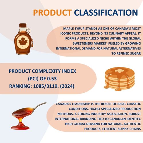 From a trade classification standpoint, maple sugar and maple syrup fall under the broader category of Other Sugars, reflecting their status as a sweetener derived directly from agricultural production. With a Product Complexity Index (PCI) of 0.53, they rank 1,085th out of 3,119 in 2024, identifying them as a moderately complex product requiring specialized harvesting, processing, and quality‑control practices.