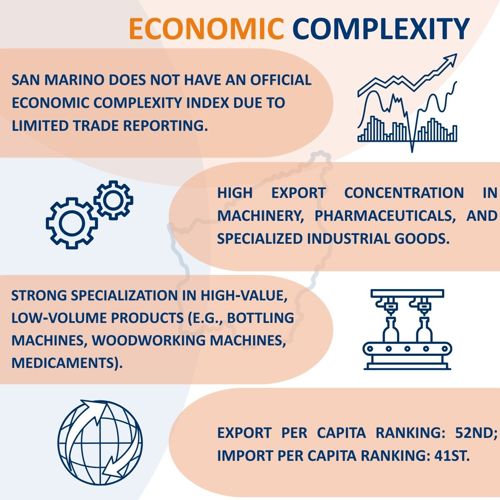 San Marino’s trade profile is characterized by specialization rather than diversification. While data on its Economic Complexity Index is limited, the country demonstrates comparative advantages in machinery and niche industrial products, reflecting a focus on high-value, low-volume exports.