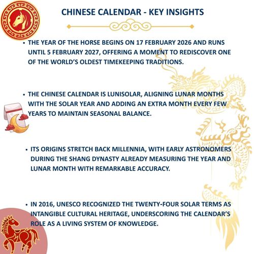 Today, 17 February 2026, marks the beginning of the Year of the Horse, which will continue until 5 February 2027. This transition offers a timely opportunity to look more closely at the system that defines these cycles: the Chinese calendar, one of the world’s oldest timekeeping traditions still in use.
