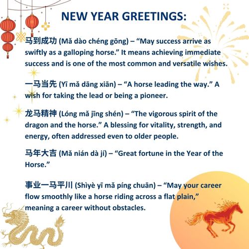 The symbol of the horse is still very prominent in modern Chinese, especially in chengyu (成语) and auspicious slogans. This shows how traditional Chinese culture continually renews itself, keeping ancient symbols alive while adapting them to the present. The horse appears frequently in New Year greetings because it is associated with rapid success and progress. Here are some common expressions: