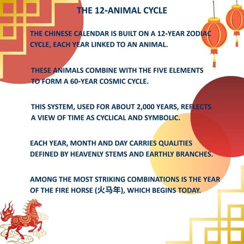 At the heart of the Chinese calendar is a repeating 12‑year cycle, each year represented by an animal: Rat, Ox, Tiger, Rabbit, Dragon, Snake, Horse, Goat, Monkey, Rooster, Dog and Pig. These are combined with the Five Elements (Wood, Fire, Earth, Metal, Water), creating a 60‑year cycle that shapes cultural identity and personal symbolism. This sexagenary cycle (Ganzhi) has been in use for about 2,000 years and reflects a philosophical view of the world: the Heavenly Stems and Earthly Branches were linked to yin and yang and to the Five Elements. In traditional thought, time itself was cyclical and infused with cosmic qualities, so a given year, month, or day possessed characteristics defined by these celestial patterns. Among these combinations, one of the most discussed and fascinating is of course the Year of the Fire Horse, in Chinese 火马年 (huǒ mǎ nián), which begins today.