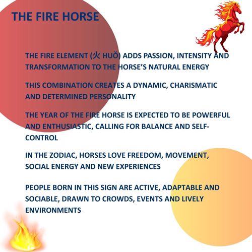 The Fire element (火 huǒ) represents passion, enthusiasm, impulsiveness, and transformation. When fire combines with the horse, an extremely dynamic, charismatic, and determined figure emerges. The Fire Horse sign is associated with brilliant, enterprising individuals who are hard to stop, though sometimes marked by impatience or a rebellious streak. In essence, the Year of the Fire Horse is expected to be a powerful and “fiery” one, though it also calls for balance and self‑control.