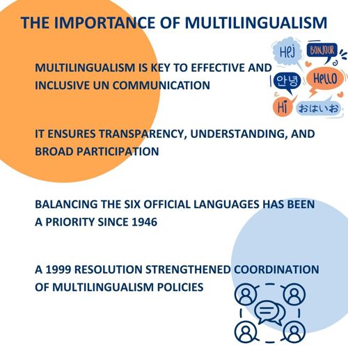 Multilingualism is a cornerstone of effective communication and cooperation at the United Nations. It promotes tolerance, inclusivity, and equitable participation among Member States. By ensuring that multiple languages are represented and used, the UN strengthens transparency, enhances understanding, and broadens engagement in its work.