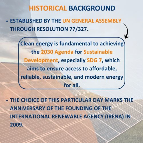 The International Day of Clean Energy was established by the UN General Assembly through resolution 77/327, recognizing that clean energy is fundamental to achieving the 2030 Agenda for Sustainable Development, especially SDG 7, which aims to ensure access to affordable, reliable, sustainable, and modern energy for all.
