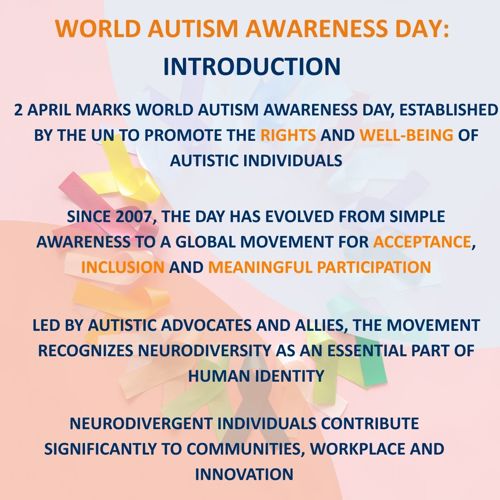 Every year on 2 April, the international community marks World Autism Awareness Day (WAAD), a United Nations–designated observance dedicated to promoting the rights and well‑being of autistic individuals around the globe. Since its establishment in 2007, WAAD has evolved from an awareness‑raising initiative into a powerful global movement advocating acceptance, inclusion, and meaningful participation of autistic people in all areas of society. Driven largely by autistic advocates and allies, this shift reflects an increasing understanding of neurodiversity as an integral part of human identity and of the value neurodivergent individuals bring to communities, workplaces and innovation systems.