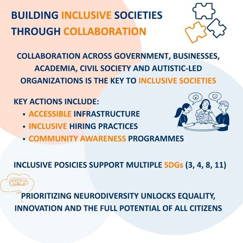 Panels and keynote sessions address a range of interconnected topics: inclusive healthcare, quality education, accessible employment, reducing inequalities, and designing autism‑friendly cities. By examining the links between neurodiversity and the SDGs, the event highlights how empowering neurodivergent individuals contributes directly to building resilient communities, fostering innovation, and strengthening social and economic sustainability.