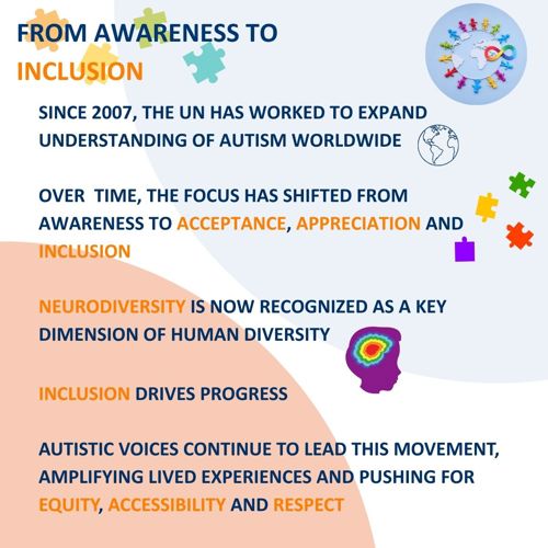 The original UN General Assembly resolution of 2007 (A/RES/62/139) emphasized the need to expand public understanding of autism. Seventeen years later, the conversation has broadened significantly, moving beyond awareness to actively promoting acceptance and appreciation. Today, neurodiversity is recognized as a key dimension of human diversity, shaping experiences, creativity and problem‑solving in unique ways. This global shift acknowledges that inclusion is not only a matter of human rights but also a driver of social and economic progress. Autistic individuals continue to play a crucial role in advancing this movement, amplifying lived experiences and advocating for equity, accessibility and respect.