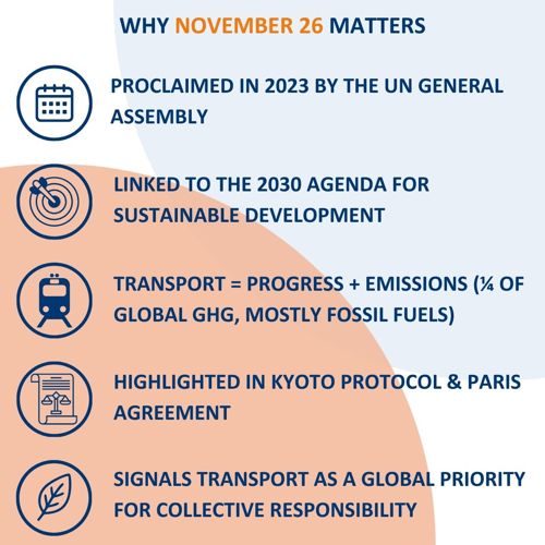 The observance of 26 November was proclaimed by the UN General Assembly in 2023, acknowledging the vital role of sustainable transport in achieving the 2030 Agenda for Sustainable Development. The resolution highlights the need for integrated intermodal systems (roads, railways, waterways, airways, and ports) that are resilient, energy-efficient, and environmentally friendly. It also emphasizes the importance of international cooperation to ensure transport contributes to economic growth, social welfare, and climate action.